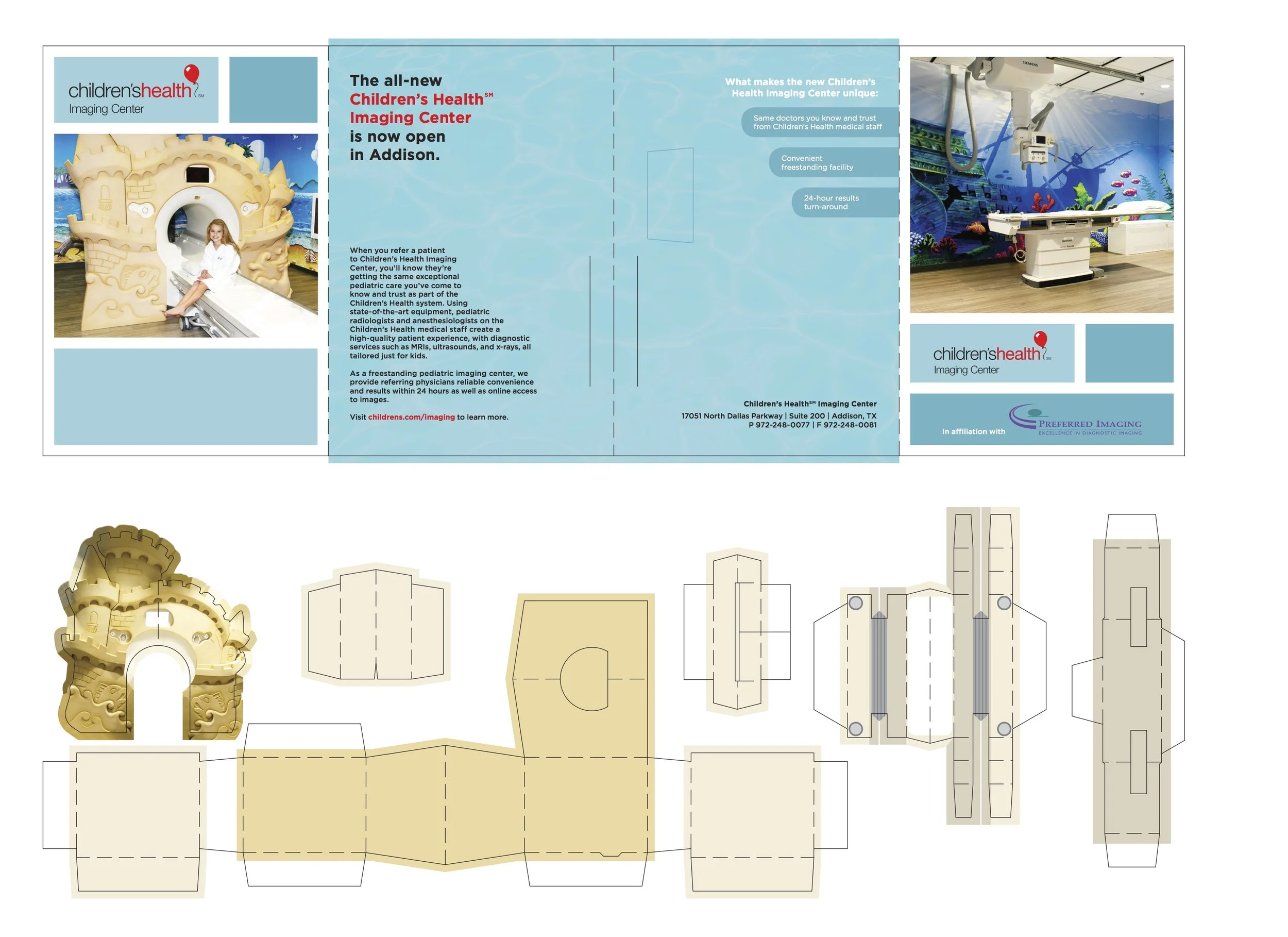 For the opening of a brand new imaging center, my art director partner and I concepted and created a direct mail piece that was a pop-up of the imaging machine to showcase everything Children's Health does to make children feel comfortable in their facilities.